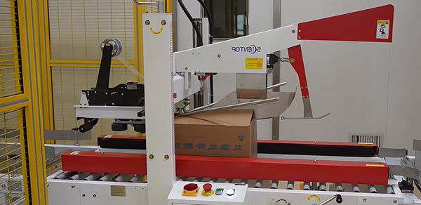 該工位將由上游輸送來的未封蓋的紙箱,通過膠帶實現自動封箱,密封方式可為一字封或定制其他膠帶封箱樣式;同時,可增配自動扎帶設備;通過調節可適用于不同尺寸的紙箱。